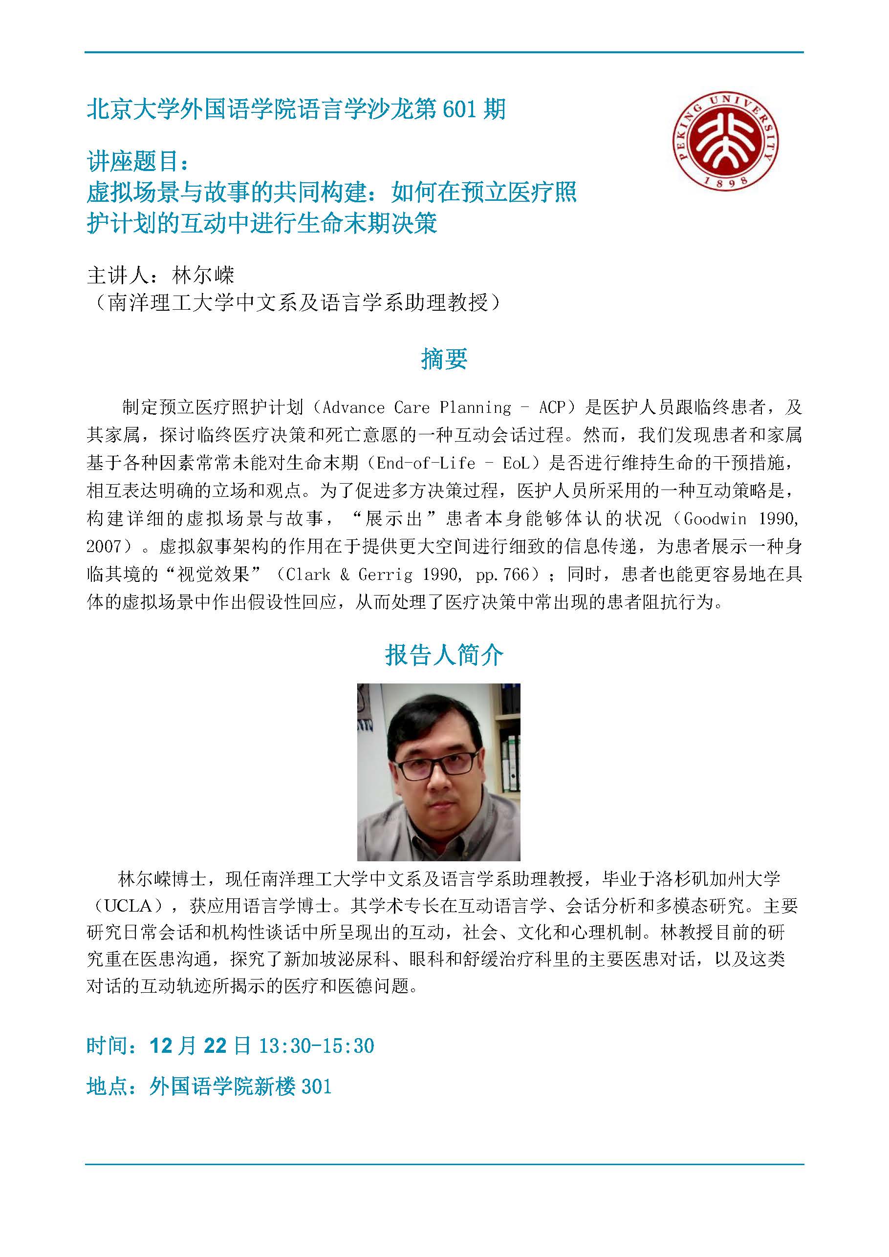 bat365登录平台入口语言学沙龙第601期:虚拟场景与故事的共同构建:如何在预立医疗照护计划的互动中进行生命末期决策