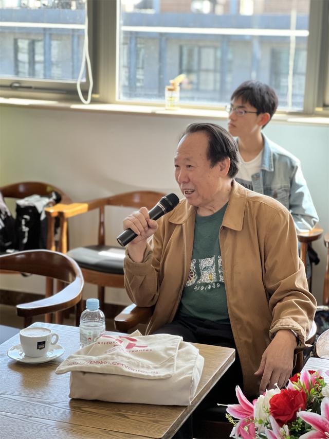 随后,在bat365登录平台入口咖啡书苑,赵振江老师与师生们座谈,分享自己的翻译生涯与感悟。他说这是一个难得的机会,让他能对自己的翻译生涯做一个简单的梳理和回顾。现场放映的一张张图片承载着宝贵的回忆,赵老师生动地讲述了七十年代末八十年代初在墨西哥进修的生活、八十年代末在西班牙格拉纳达大学翻译《红楼梦》时艰苦的工作,以及1995年获得智利鲁文·达里奥“蓝色百年”奖时独特的经历等。赵老师回忆道,为翻译《红楼梦》,他和两位西班牙译者加班加点工作,甚至连周末和圣诞节都没有休息。他翻译阿根廷高乔史诗《马丁·菲耶罗》是纯粹出于兴趣,出于对诗歌的热爱,并未考虑过刊印发行。在时代风云中,它的出版成为了文化外交大事,促进了中阿两国人民相互了解和交流。有阿根廷出版社为赵振江教授印制了《马丁·菲耶罗》专属版。世上仅此一本,独一无二。赵老师娓娓道来,幽默风趣,在座师生如沐春风,不时发出会心的笑声。