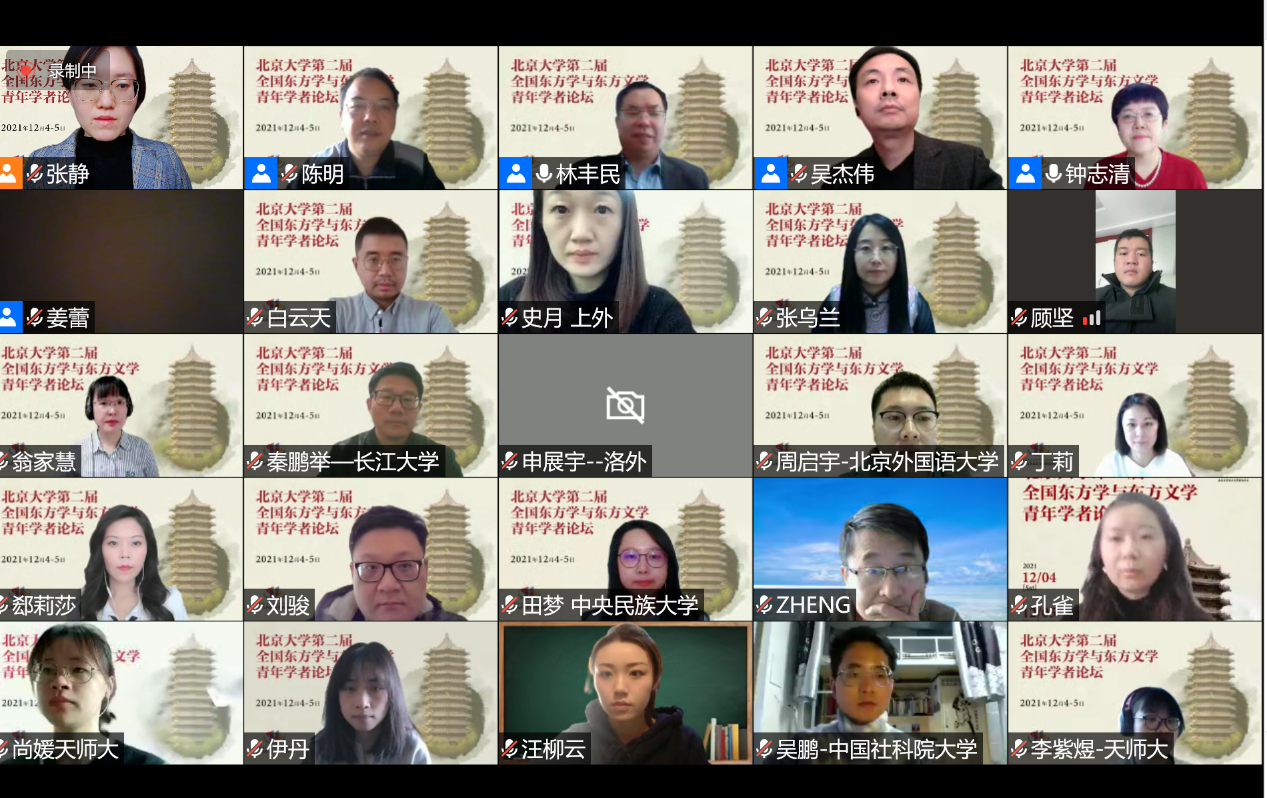 12月4日至5日,由教育部人文社会科学重点研究基地bat365登录平台入口东方文学研究中心主办的“bat365登录平台入口第二届全国东方学与东方文学青年学者论坛”通过线上会议的方式顺利召开。共有来自bat365登录平台入口、清华大学、中国社会科学院大学、日本早稻田大学、埃及亚历山大大学、中央民族大学、北京外国语大学、中山大学、上海外国语大学、内蒙古大学、广西大学、广西师范大学、南开大学、天津师范大学、天津科技大学、山西师范大学、信息工程大学、南京林业大学、扬州大学、常州大学、长江大学、牡丹江师范学院、湖北恩施学院等20余所高校和研究机构的近90位专家、教授和青年学者参与了本次论坛。