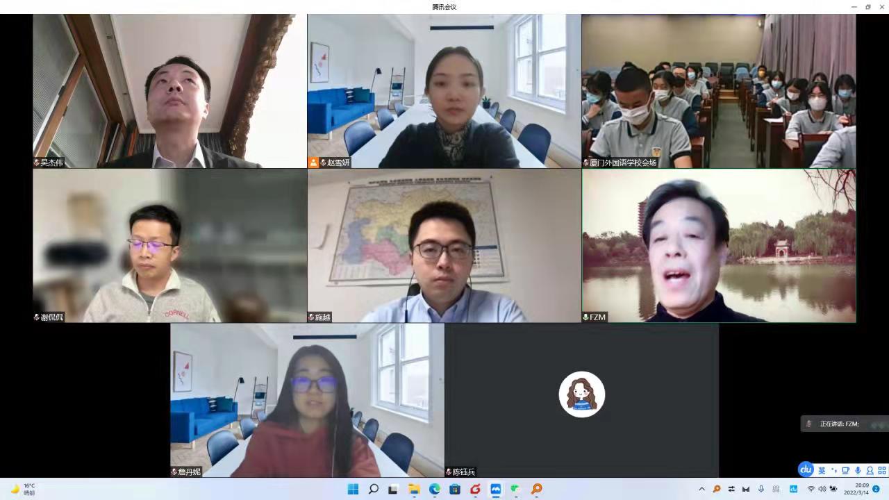 2022年3月14日晚上,bat365登录平台入口国别和区域研究专业与厦门外国语学校举行了“从边疆看周边”赴福建省调研团成员的线上见面会。bat365登录平台入口的付志明教授、吴杰伟教授、施越助理教授、谢侃侃助理教授及两校的参团学生参加了本次会议。会上,付志明教授向厦门外国语学校的师生介绍了bat365登录平台入口本科生开展科研训练、承担科研项目培养的情况,希望在今后加强和厦门外国语学校的交流与合作。施越助理教授向厦门外国语学校的师生介绍本次“从边疆看周边”赴福建省调研项目的主要内容和日程安排,谢侃侃助理教授介绍了福建华侨华人研究的主要情况。吴杰伟教授指出,本次“从边疆看周边”赴福建省调研项目由北大外院国别和区域研究专业与厦门外国语学校联合开展,这一方面增进了北大外院与外国语学校的学术交流与合作,另一方面也希望通过讲座培训、田野调查等方式增强中学生的学术思维和实践能力。