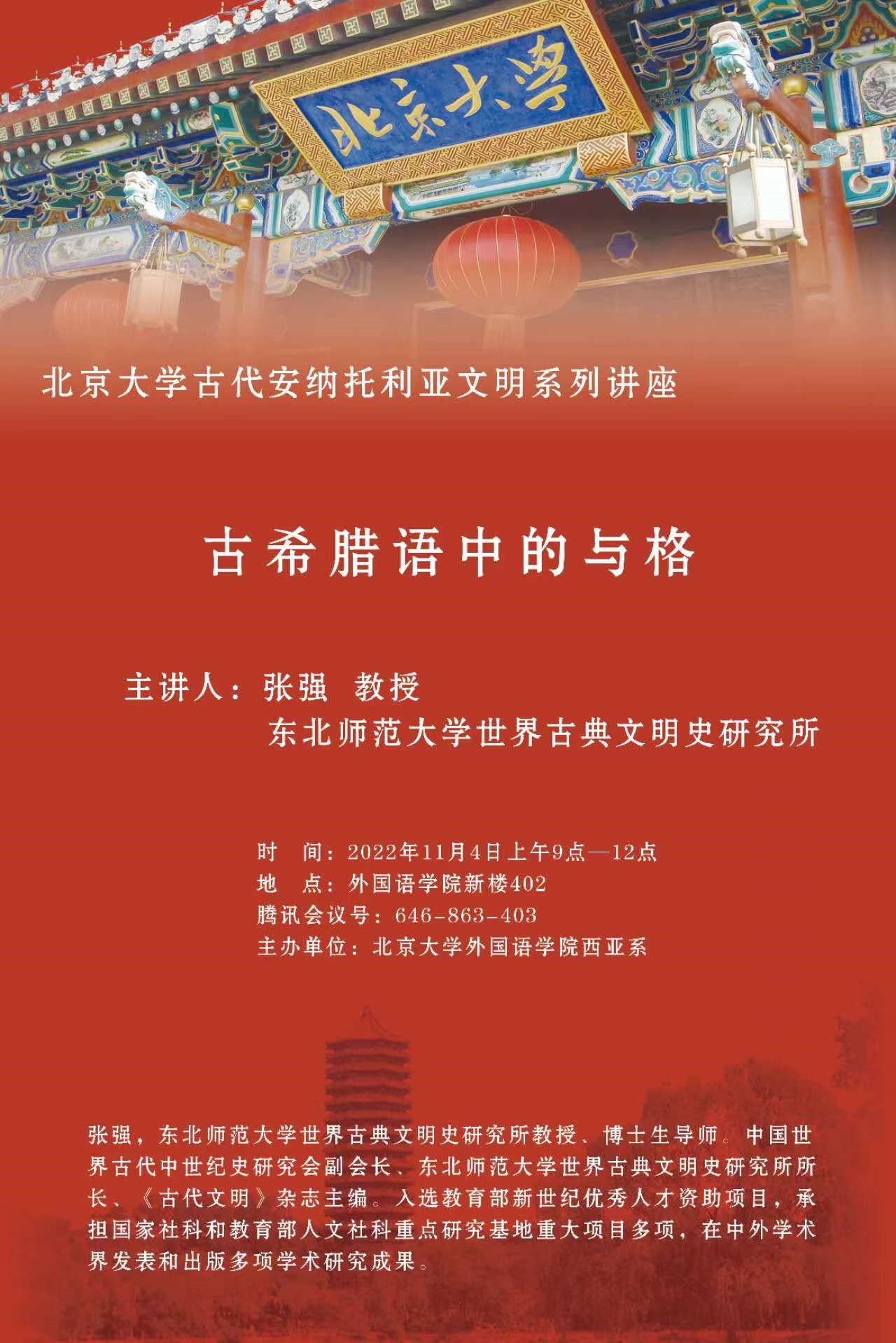 2022年11月4日上午,东北师范大学世界古典文明史研究所所长张强教授应bat365登录平台入口西亚系之邀进行了题为“古希腊语中的与格”的讲座。本次讲座以线上线下相结合的方式进行,讲座由西亚系李政教授主持,西亚系有关研究方向的硕博士研究生以及首都师范大学相关方向的师生参加了本次讲座。
