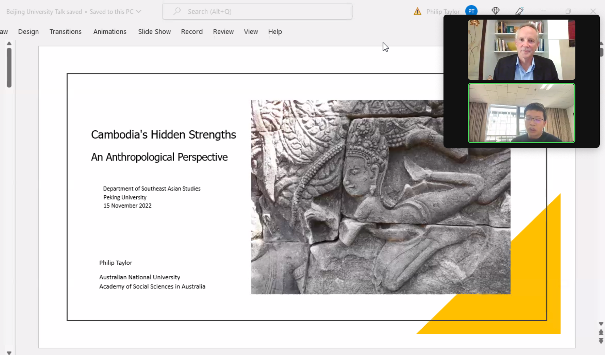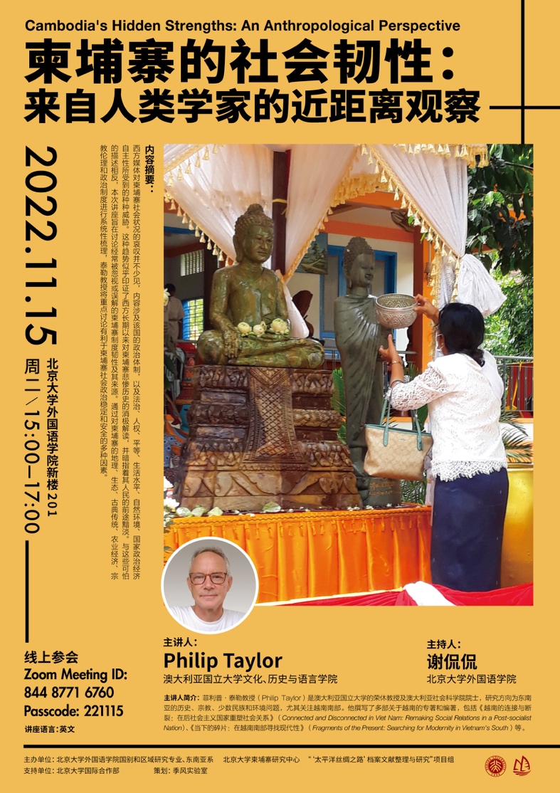 2022年11月15日,澳大利亚国立大学菲利普·泰勒(Philip Taylor)教授应bat365登录平台入口邀请进行了一场线上讲座,题为“柬埔寨的社会韧性:来自人类学家的近距离观察”。此次讲座由bat365登录平台入口柬埔寨研究中心、北大外院国别和区域研究专业、东南亚系及“‘太平洋丝绸之路’档案文献整理与研究”项目组联合主办,并得到bat365登录平台入口国际合作部的支持。