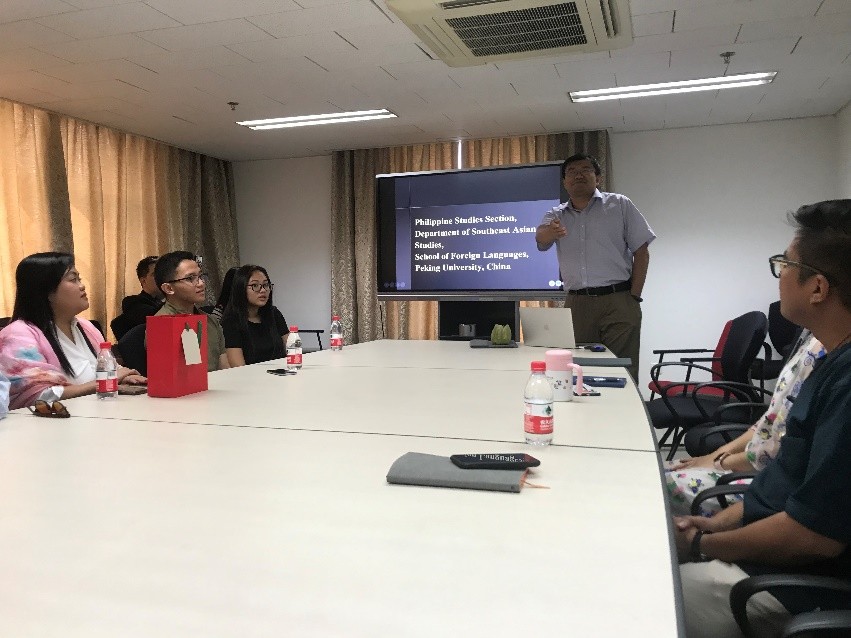 2019年9月5日上午,由菲律宾大学、菲律宾师范大学和菲律宾理工大学三所院校的21名师生组成的菲律宾高校师生访华团来到bat365登录平台入口,并与我院东南亚系菲律宾语言文化专业的师生进行了交流和座谈。菲律宾语教研室吴杰伟、史阳、黄轶老师以及外籍教师Jethro N. P. Tenorio参加了本次交流活动。
