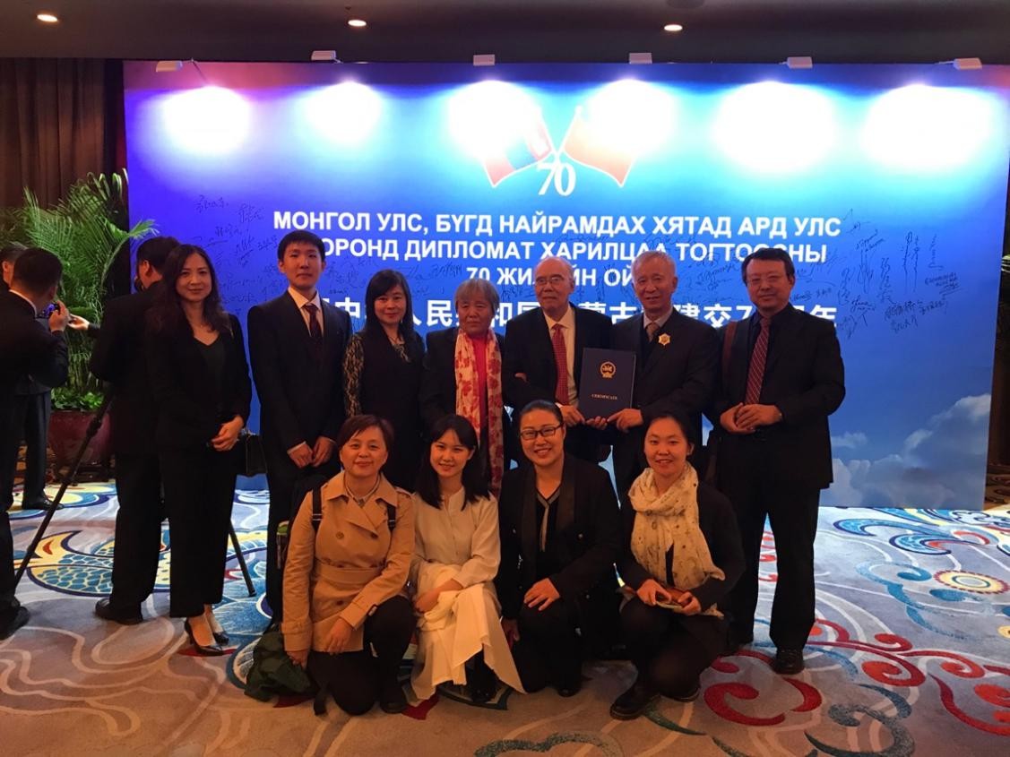 图 5 姚老师获奖后与前中华人民共和国驻蒙古国大使黄家骙及bat365登录平台入口师生合影