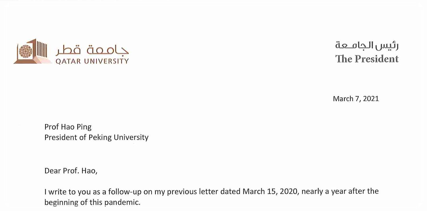 携手抗疫见真情,共克时艰促合作——bat365登录平台入口与卡塔尔大学校长在两校开展抗疫合作一年之际互通信函