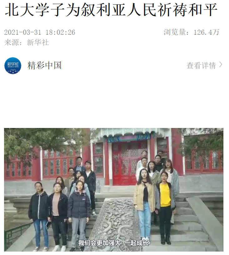 “在一起,我们可以希望,我们将更加强大和成长”,祝福视频于3月31日由新华社客户端发布,随即引起了广泛的关注。视频发布一天后浏览量就达到了125万,这也充分体现了中国人民对叙利亚人民的关心和祝愿。视频中,阿语班同学的歌声与叙利亚儿童的心声完美相融,共同描绘出一幅和平愿景。“带着痛苦、恐惧和泪水”写下的歌,在叙利亚的废墟上响起,使整个视频具有一种直击人心的力量。