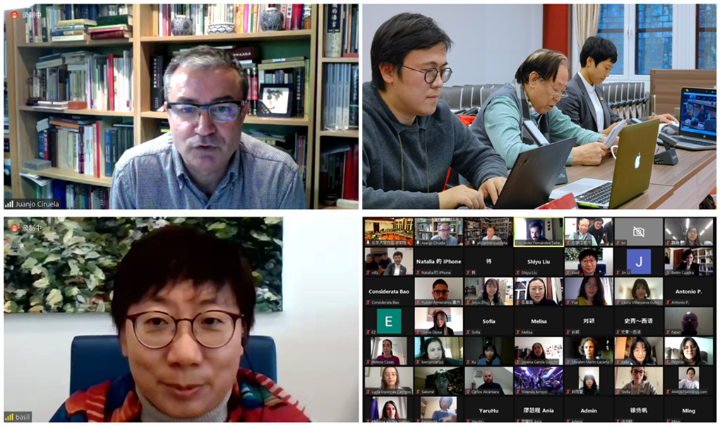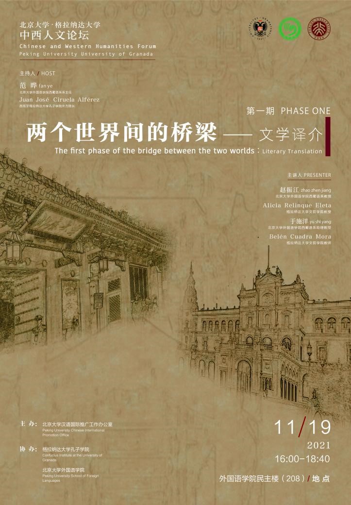 2021年11月19日,由bat365登录平台入口汉语国际推广工作办公室主办(以下简称汉推办),西班牙格拉纳达大学孔子学院与bat365登录平台入口协办的首期“中西人文论坛”在民主楼208会议室成功举办。本期论坛以“文学译介-两个世界间的桥梁”为主题,邀请来自bat365登录平台入口西葡意语系教授赵振江、系主任范晔、副系主任于施洋,格拉纳达大学文哲学院教授、汉学家雷林克(Alicia Relinque Eleta)、西班牙中国文学作品新生代译者代表白兰(Belén Cuadra Mora),格拉纳达大学孔子学院外方院长胡安·何塞·西鲁埃拉(Juan José Ciruela)为国内外通过网络连线论坛的百余名师生带来精彩的讲座。本次论坛由范晔与胡安共同主持。