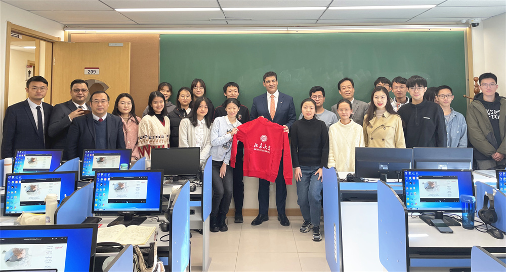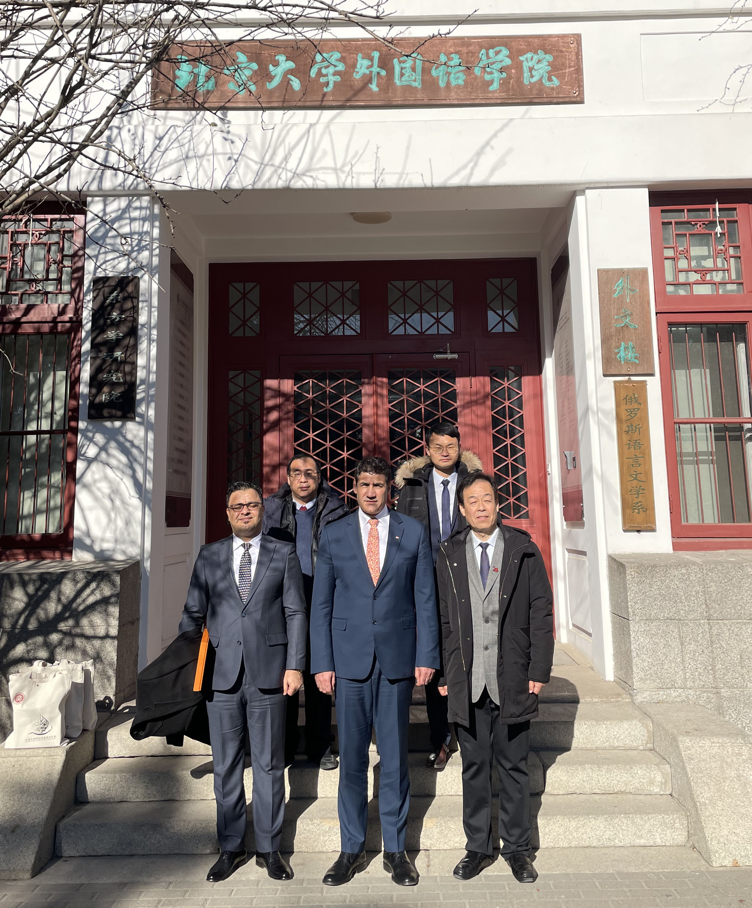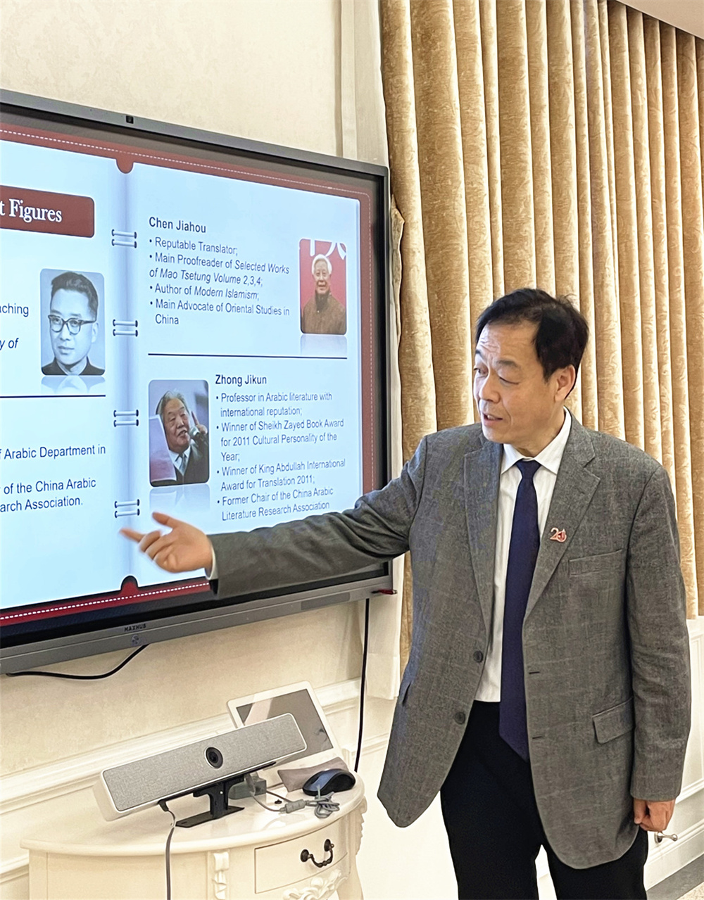 随后,赛义德大使在阿语系教师的带领下参观北大校园并于阿语系教师展开座谈。付志明教授向大使介绍了北大外院和阿语系的专业历史、发展现状和学科建设情况,并赠送阿语系出版的中、阿双语字典及部分学术专著作。双方围绕深化交流合作进行了探讨。