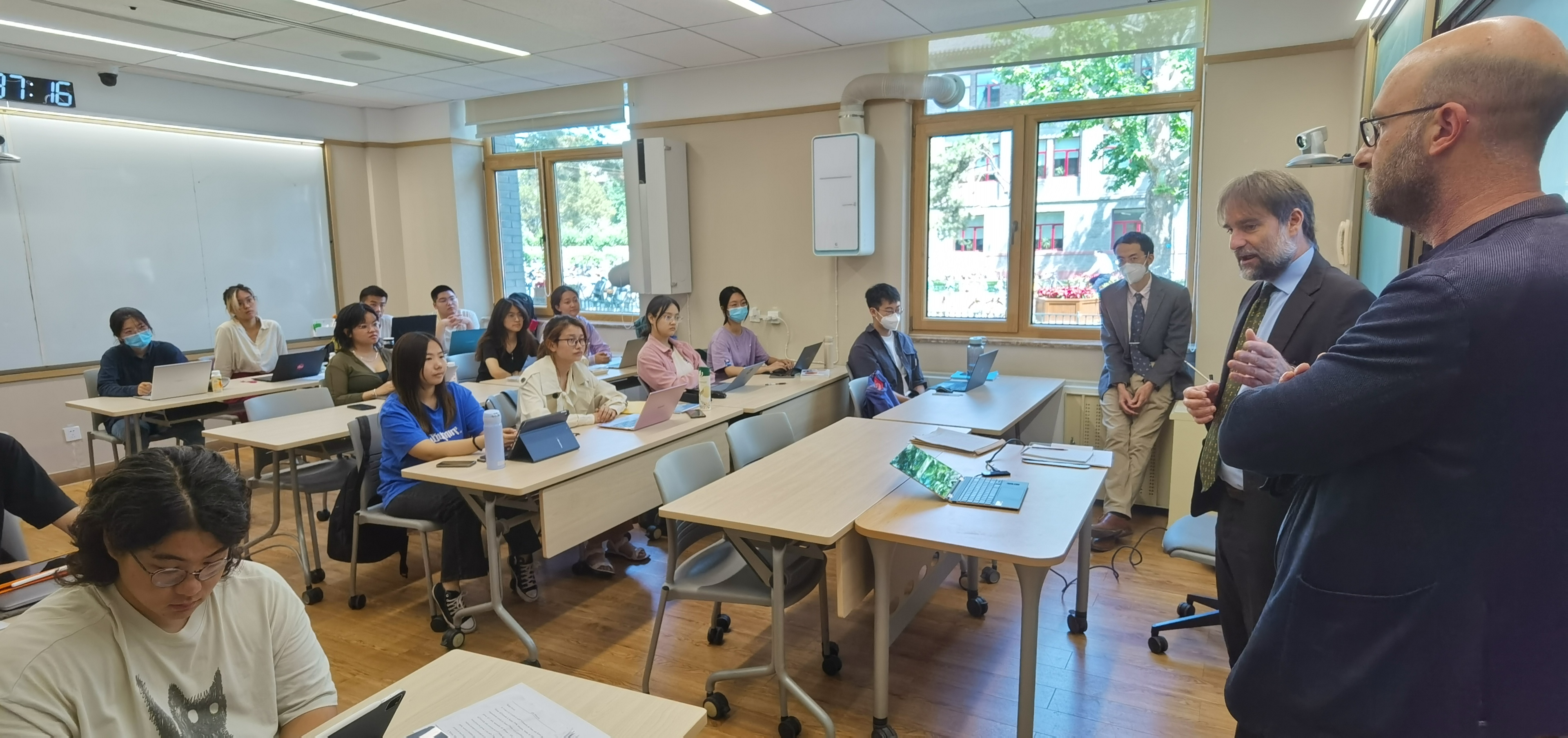 菲德利克参赞一行首先来到地学楼110教室,与意大利语专业的师生进行了座谈。参赞向同学们介绍了自己与中国及bat365登录平台入口的渊源,并结合意大利的历史、艺术、音乐、饮食等不同领域,向同学们全面介绍了意大利文化以及当下中意文化交流活动的相关情况。同学们积极提问,探讨了中意两国大学及教育体系的异同、文化处的工作范围和文化活动的组织、意大利文化传统以及年轻人所关注的文化现象等话题,与参赞进行了深入交流。