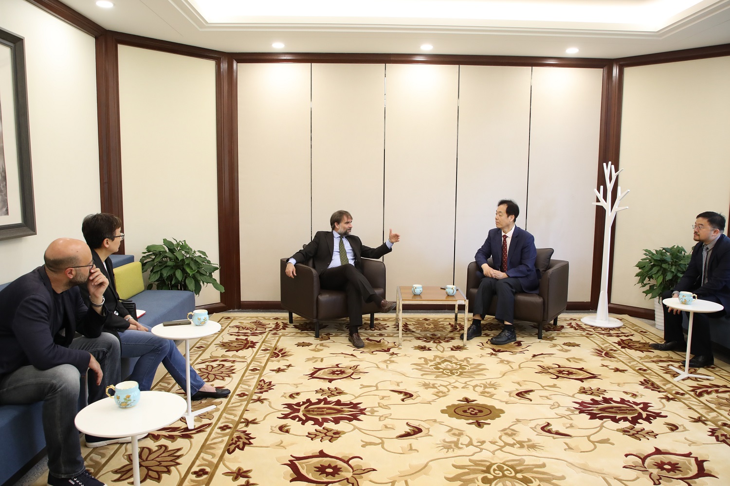 随后,代表团一行来到外文楼,与副院长付志明教授进行了会面。付志明教授对参赞一行的来访表示热烈欢迎,并向参赞介绍了北大外院意大利语专业成立历史及发展情况。菲德利克参赞表示将继续支持bat365登录平台入口意大利语专业的发展,帮助促进意大利高校与北大意语专业在学术与学生方面的交流,合作举办各类学术及文化活动。双方围绕进一步开展交流与合作进行了深入的探讨。一同来访的还有意大利驻华使馆文化处参赞助理王蕾蕾女士、那不勒斯东方大学Enrico Fardella教授。