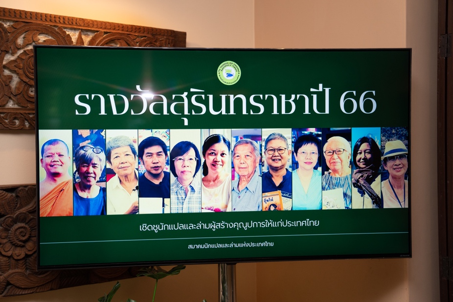 资深翻译家汶雅叻·温亚梯萨潭(左)为未能到达现场的熊燃老师颁奖,评委会成员代为领奖