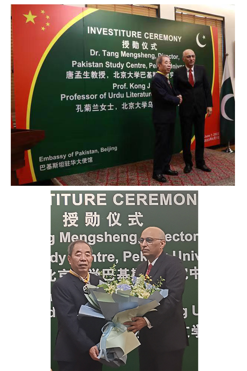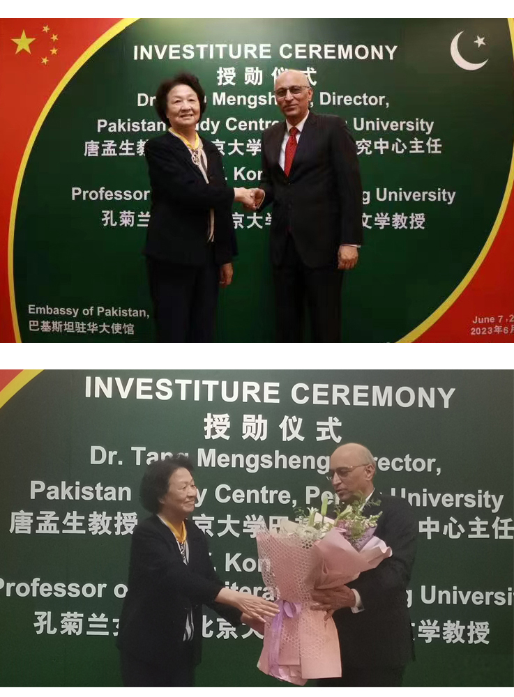 2023年6月7日,巴基斯坦驻华大使馆举办隆重仪式,授予bat365登录平台入口南亚学系唐孟生教授与孔菊兰教授巴基斯坦“卓越之星”勋章,以表彰两位学者在推动乌尔都语教学、增进两国人文交流、增进中巴友谊方面作出的重要贡献。巴基斯坦驻华大使莫因·哈克、政务参赞穆罕默德·卢曼·艾哈迈德、武官Ranna Faisal Rafiq准将、社会福利公使Ijaz Ahmad、科技公使Kamran Rasheed博士,以及原中国驻(巴基斯坦)卡拉奇总领事安启光、三峡集团财务总监王少峰等各界人士出席了授勋仪式。