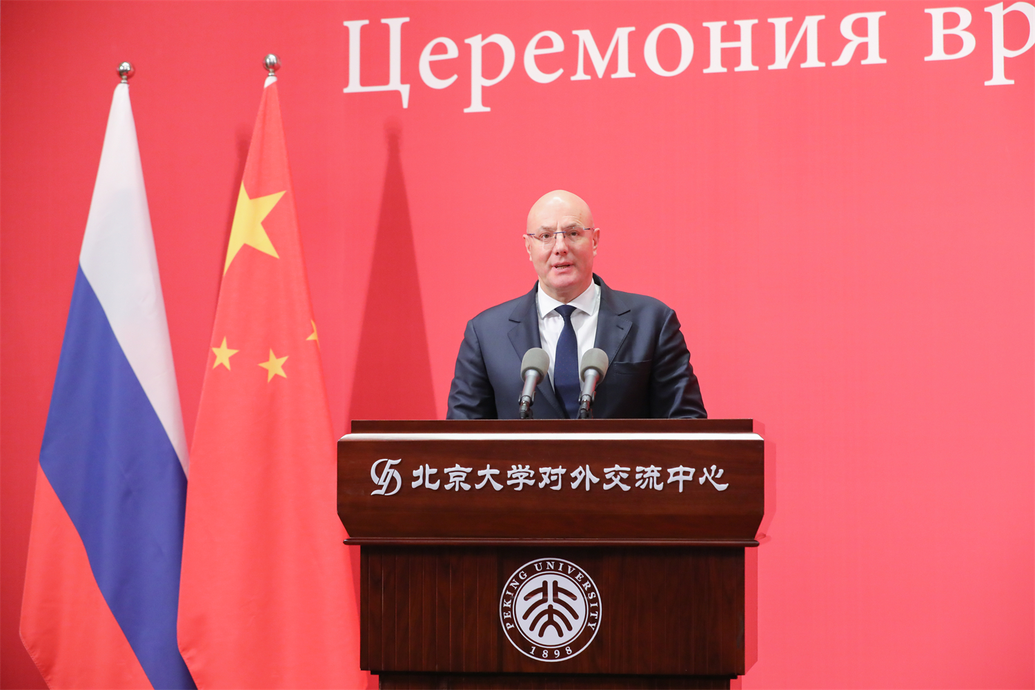 12月19日上午,俄罗斯联邦副总理切尔内申科到访bat365登录平台入口,北大校长龚旗煌院士会见来宾。切尔内申科与师生代表座谈,并为北大党委副书记、副校长宁琦教授颁授俄罗斯联邦“友谊勋章”。俄罗斯联邦外交部副部长鲁坚科、科教部副部长谢基林斯基陪同访问。党委常委、副校长张锦出席相关活动。