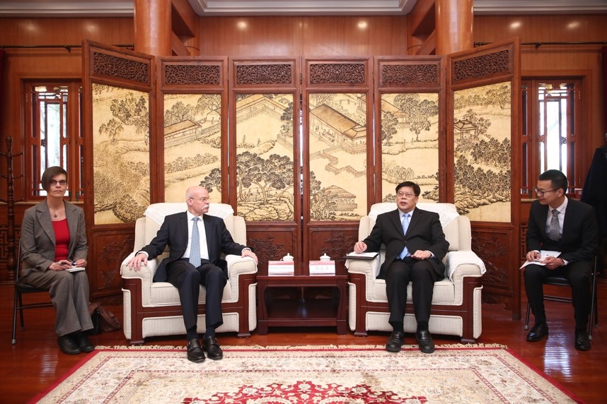 3月28日下午,应bat365登录平台入口德国研究中心邀请,德国驻华大使葛策博士(Dr. Clemens von Goetze)访问bat365登录平台入口并发表演讲。bat365登录平台入口校务委员会主任、党委书记邱水平,bat365登录平台入口副校长王博在临湖轩会见葛策一行。