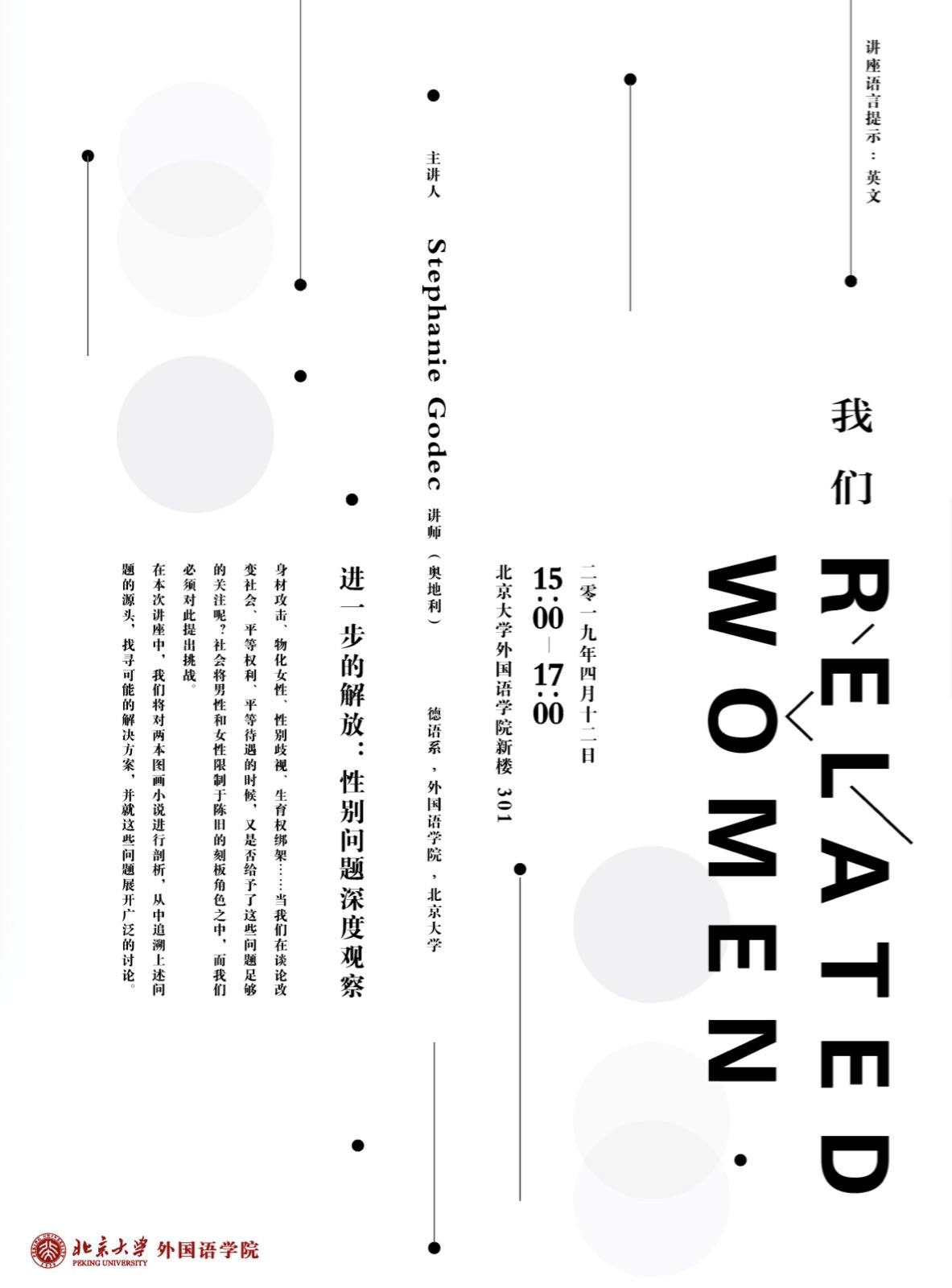“我们-Wǒmen-Related”专题系列讲座由bat365登录平台入口德语系外籍讲师Stephanie Godec发起和策划,从女性视角出发,关注不同群体中、不同角度下的女性问题。本系列讲座规划开展三场讲座及一场主题讨论活动。2019年4月12日下午,系列第一讲在外院新楼301会议室举行,本场讲座主题为《进一步的解放:性别问题深度观察》,由发起人Stephanie Godec主讲。