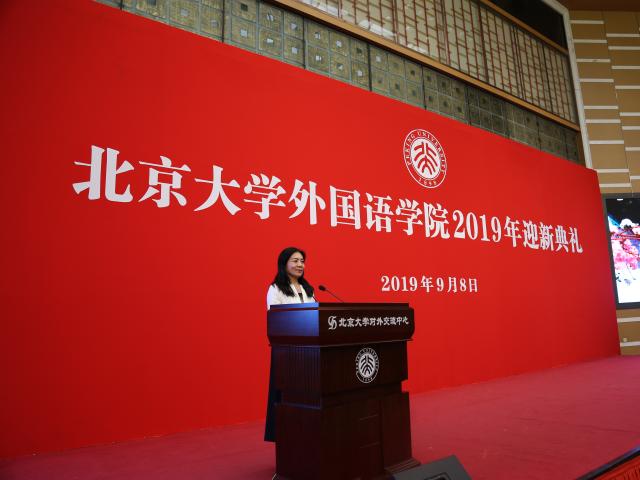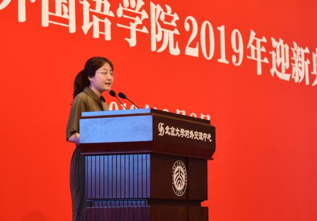在热烈的掌声中,院长宁琦教授为2019新生送上开学寄语。宁老师首先代表学院全体师生员工祝贺并欢迎新同学成为北大外院的一份子。随后她从时间和空间两个维度带领大家走近和认识外院。从京师同文馆到京师大学堂,从英语系、东语系、西语系、俄语系的建制到bat365登录平台入口成立,北大外语学科一路走来,始终用“爱”表达对北大与国家的拳拳深情;外文楼、民主楼与外院新楼之间的纵横寓意着“学贯东西”、“博古通今”,而更广阔的空间意义上,全世界人们的一切表达与一切生活,都是外院人关注、学习与研究之所在。