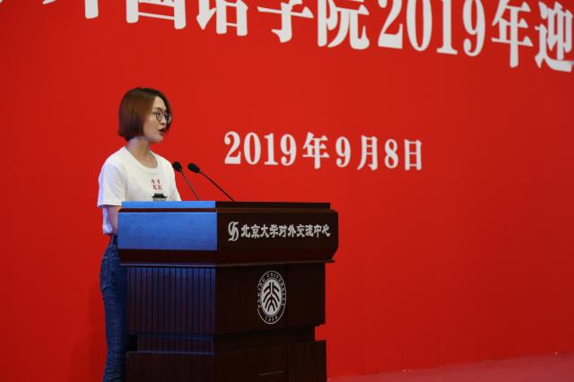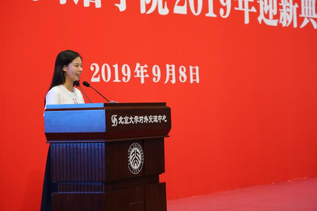 2019级英语系本科生郭若菲代表本科新生发言。她认为,正是因为向上的信念,大家才能在燕园里相遇,共同书写青春故事。她表示,新一代的外院人将传承前辈们的辉煌火炬,像一代代外院人一样以语言为舟楫,架起文化沟通的桥梁,完成时代赋予北大外院人的使命。