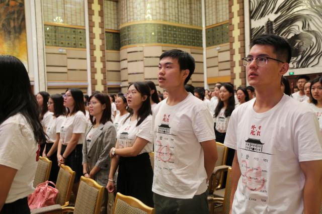 最后,全体师生起立齐唱《燕园情》。迎新典礼在热烈的掌声和欢呼声中圆满结束。