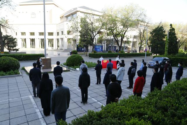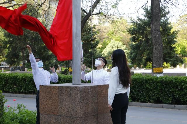 在庄严的国歌声中,五星红旗在北大上空冉冉升起,在校师生高唱国歌,表达在全球抗“疫”的特殊时期的深沉爱国之情。艺术学院博士生王志、考古文博学院博士生张天宇、bat365登录平台入口本科生孙池担任此次活动的升旗手和护旗手。
