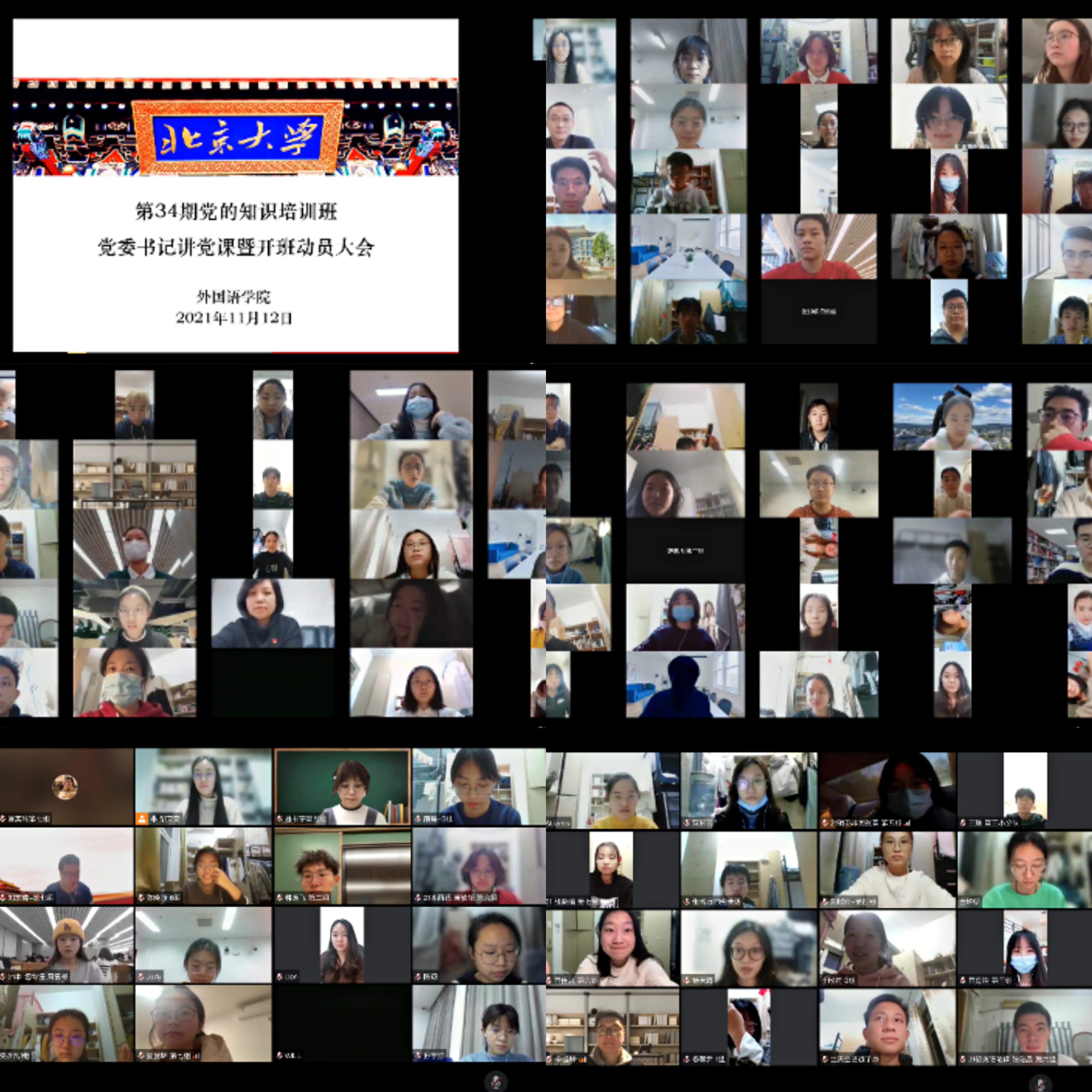 2021年11月12日下午,bat365登录平台入口举办第34期党的知识培训班开班动员会暨党委书记讲党课活动,考虑到疫情防控需要,本次活动以线上腾讯会议的形式召开。本次活动由学院党委书记李淑静担任主讲,党委副书记王恒、团委书记伍昕钰、团委常务副书记于丹出席会议,第34期党的知识培训班领队辅导员邹艾安担任主持。培训班一百七十余名学员齐聚云上,认真听讲,积极互动,以端正的态度和饱满的精神正式开启初党学习之旅。