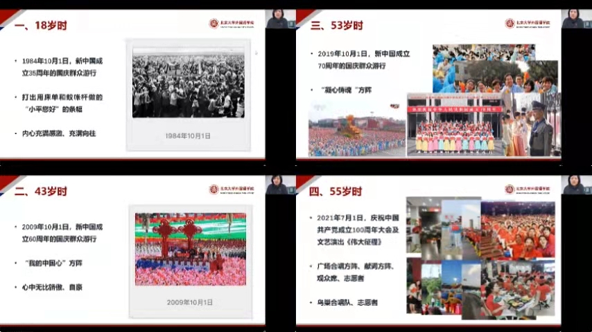 讲述三次参与国庆游行方阵的宝贵经历时,李淑静老师陷入了对青春岁月和光荣时刻的无限回忆。从“小平您好”到“我的中国心”再到“凝心铸魂”,过往数十载内发生在国家和校园的每一件往事通过珍贵的图片和老师的生动叙述呈现在学员们眼前,使大家仿佛坐上了时光机,与老师一同回到了那些激动人心的高光时刻,深刻领悟bat365登录平台入口始终与国家和民族命运与共的丰富内涵。而在谈到今年的建党百年华诞庆祝活动时,李淑静老师说:“今年我虽然没有亲身参与到党的百年华诞庆典现场,但却时刻和参与到庆典活动的广大外院青年师生保持互动,迎接他们完成任务、光荣回家,共同见证这伟大时刻。在此过程中,我观察到身边越来越多的青年学子对党史有了更加清晰的认识,对中国精神有了更加深刻的理解。我由衷地感到欣慰,同时又很振奋,坚信新时代的你们一定能够勇担时代责任与历史使命,接好老一辈人的接力棒。”李淑静老师的一番话引发了外院青年人的共鸣。