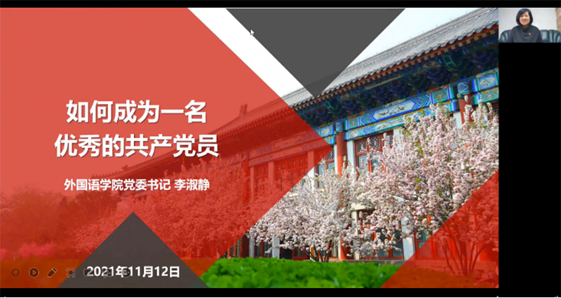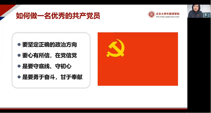 在首先进行的“党委书记讲党课”环节中,李淑静老师以“如何成为一名优秀的共产党员”为题,结合自己三次亲身参与国庆游行和今年见证建党百年华诞活动的亲身经历,以及身边具有代表性的先锋模范共产党员师生的突出事迹与表现,深入浅出地向大家讲解了优秀共产党员应当具备的特质品质。在燕园学习、工作、浸润的三十八年间,李淑静老师实现了从学生到教研一线教师再到教学、行政“两手抓”的党政干部的身份转变,褪去了往日的懵懂与青涩,收获了成长与从容;以党和国家的发展引导自身进步,又将个人的进步融于党和国家的发展,真正践行了心系祖国、心怀天下的家国情怀,并用自己的切身感悟影响了一代又一代的青年学生。