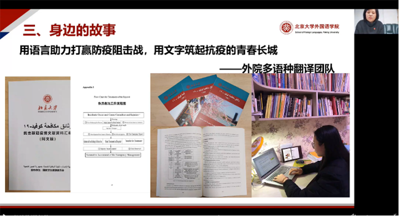 李淑静老师讲述的以仲跻昆先生、外院多语种翻译团队和朱睿智师姐等为代表的北大优秀共产党员的先进事迹,同样对学员们产生了极大的鼓舞作用。特别是去年疫情期间应运而生的外院多语种翻译团队,许多成员就是大家身边、现就读于各个语言专业的师兄师姐、师弟师妹。疫情爆发后,在院党委的领导下,百余名学生志愿者积极加入海外物资和防疫文件的翻译工作,并秉持着认真负责的态度严格校对、反复修改、广泛宣传,让外院人虽不能白衣披甲,却也可以用语言能力投身防疫一线。这种发挥专业特长、脚踏实地为人民服务的精神,正是共产党员历久弥新的品质之一。与此同时,仲跻昆先生的敢为人先与初心坚守,以及朱睿智师姐的大爱无疆与大局意识,也引发了学员们对优秀共产党员特征的深入思考。