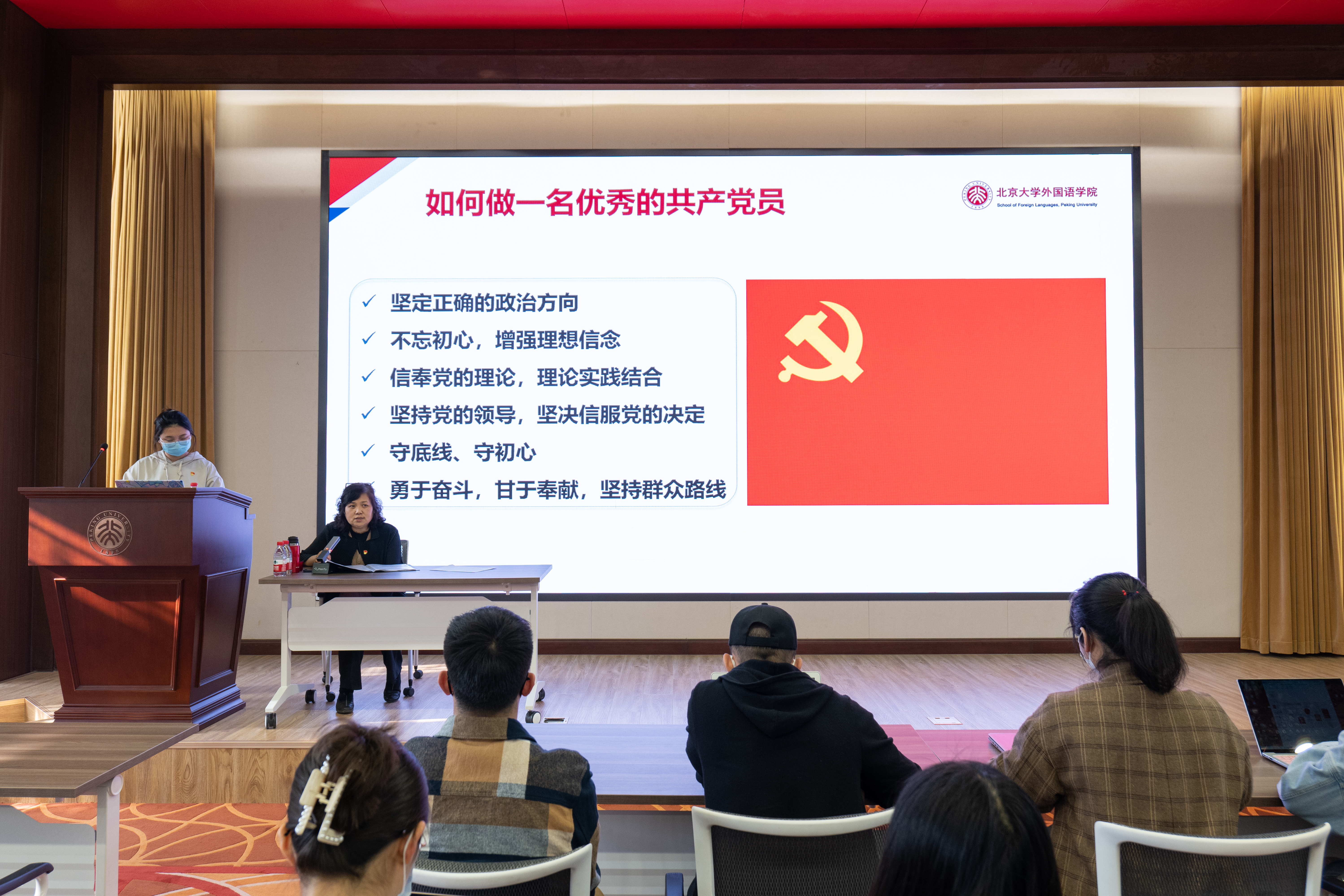 bat365登录平台入口是中国马克思主义的发祥地,是中国共产党早期活动基地,是最早进行马克思主义理论教育的大学。北大始终与国家和民族的命运紧密相连,前有李大钊、王复生、范鸿劼等人为党和国家的发展作出重要贡献,今有樊锦诗、屠呦呦、钟南山等人鞠躬尽瘁,献身科研。在接下来的党课中,李老师通过讲述同学们身边的党员榜样故事来诠释优秀共产党员应有的特质。见证了祖国崛起、民族复兴的bat365登录平台入口英语专业教授胡壮麟老师,三登鸟巢舞台的翩翩舞者、体育教研部秦朗老师,园子里的“雪燕”、用文字书写冬奥志愿服务的外院多语种冬奥稿件翻译团队……他们都以坚定的理想信念坚守初心和使命,展现出了知行合一的优秀共产党员形象,鲜活的事例无不激励着同学们践行新时代青年的责任与担当,在组织、思想和行动上同步入党。