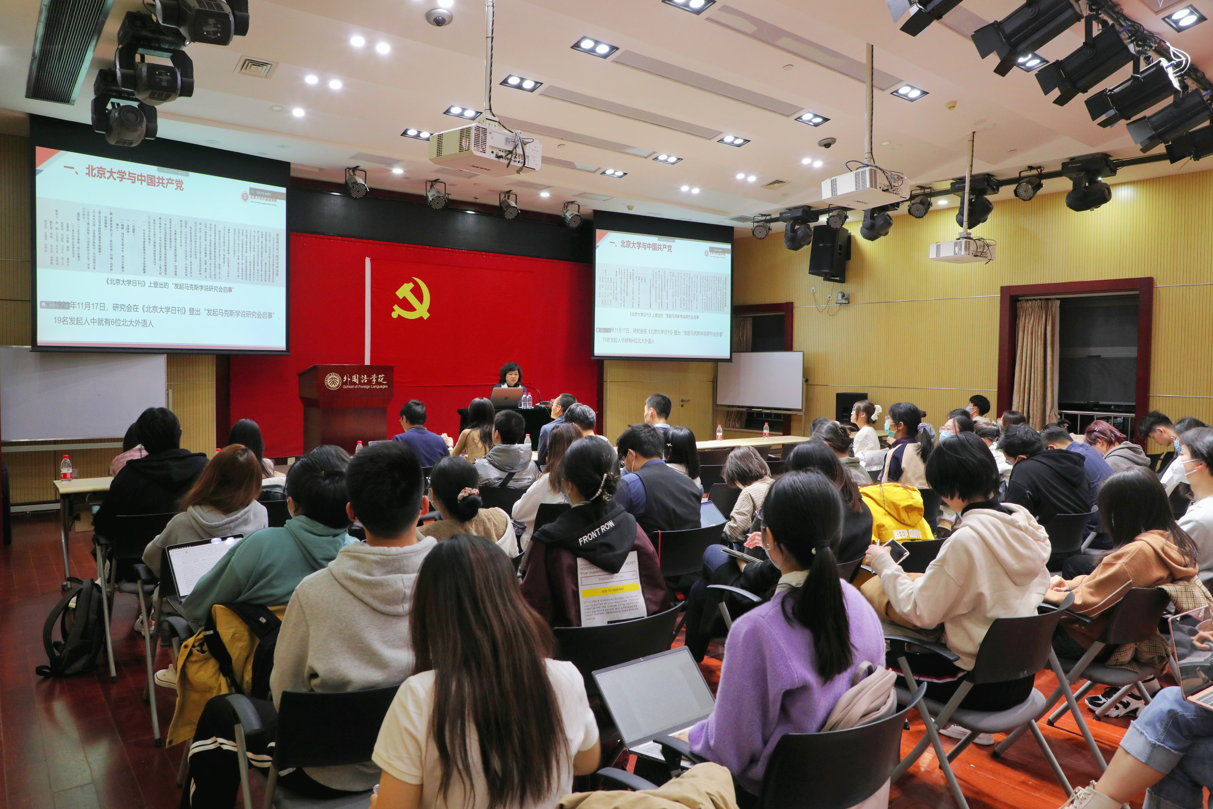 在报告第二部分,李淑静将个人融入学校的发展历程,讲述自己对于优秀共产党员特质的认识。回望历史,bat365登录平台入口作为新文化运动中心和“五四”运动策源地,作为中国最早传播马克思主义和民主科学思想的发祥地,作为中国最早传播和研究马克思主义的地方,诞生了李大钊、王复生、范鸿劼等一批为党和国家发展作出重要贡献的进步思想家,其中不乏北大外语人鞠躬尽瘁、奔走呼号的身影。立足当下,于敏、屠呦呦、樊锦诗等一个个响亮而有分量的名字回荡在未名湖畔、博雅塔下。他们用博古通今的学识与肯坐冷板凳的坚毅,急国家之所急,应人民之所需,将论文写在祖国的大地上。聚焦身边,从“党要干啥就干啥”、干一行爱一行,九十岁高龄依然亲力亲为、笔耕不辍的胡壮麟老先生;到发挥自身专业所长,用文字书写冬奥志愿服务另一条战线的外院多语种翻译团队;再到不顾疫情风险深入非洲难民社区,以青年温度传递中国温暖,用青春绘就推动构建人类命运共同体绚烂华章的朱睿智……李淑静用身边人的榜样故事生动诠释了“全心全意为人民服务”“为实现共产主义奋斗终身”的时代内涵,激励外院广大师生党员在组织、思想和行动上同步入党,心怀国之大者,秉持坚定信念,坚守初心使命,用所学沟通世界,用脚步丈量世界,践行新时代青年的责任与担当。