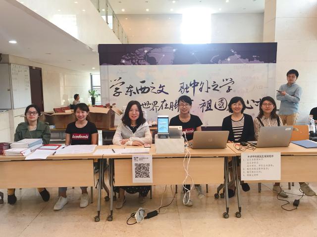 上午6:15,教务办公室和学生工作办公室的老师及学生志愿者们,准时抵达位于外院新楼的研究生外院迎新接待站,有条不紊地布置站点,进行迎新准备工作,以最真挚的笑容迎接外院新成员的到来。