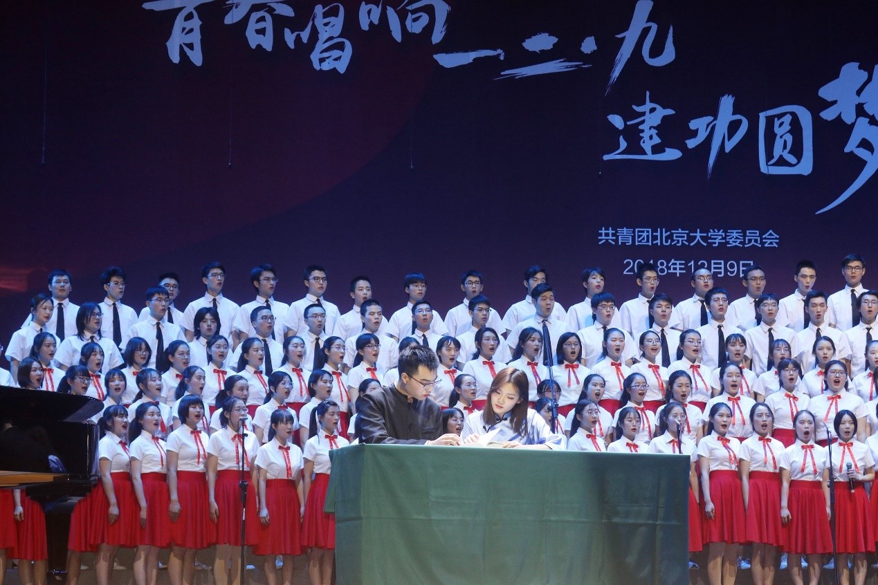 百年讲堂,大幕拉开,强队云集,座无虚席。十支学院代表队及离休教职工合唱团、校友爱乐合唱团、民主党派合唱团悉数登场,共同奉献了精彩纷呈的演出。外院代表队倾力呈现的《永远》,将整个“一二•九”师生歌会气氛推向高潮。大幕开启,指挥精准的手势和钢琴伴奏细腻的音符奏出一曲天籁;演唱之中,全体合唱团成员饱含深情、张力十足,和声处理张弛有度、拿捏细腻,呈现了一首超高水平的合唱曲目;舞台剧组生动地展现了从先驱们的筚路蓝缕到今日祖国繁荣华章中一代代前仆后继的外院人的使命与担当。落幕之时,“世界在我脚下,祖国在我心中”的响亮口号喊出了每个外院学子的心声。舞台上洋溢着的爱国之情、师生之谊、青春之华、艺术之美,征服了评委和观众。