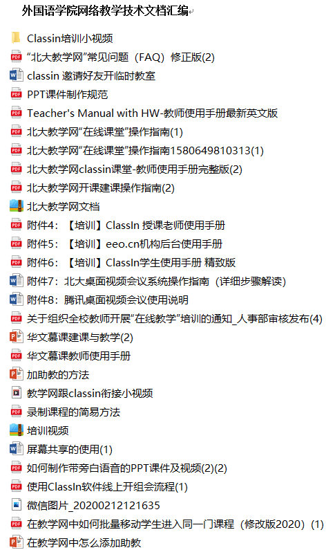 学院组织全体教师积极参与教发中心组织的系列培训,通过外院邮件群和“外院人”微信群广泛宣传,提醒老师按时参加培训,帮助老师加入各种技术服务群。同时通过“外院人”微信群向老师们分享各种平台使用技巧、操作方法等技术文档。老师们热情高涨。博雅讲席教授段晴老师、申丹老师带头学习、参加培训,并在“外院人”微信群中与大家积极互动,极大的激励了全院教师学习各种网络教学平台的热情,老师们互相帮助,很好的掌握了各类网络授课技能。