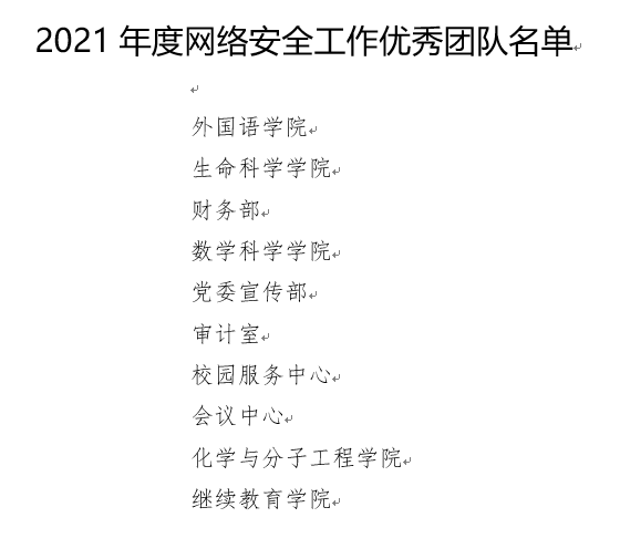 根据学校整体部署,网信办牵头启动了网络安全年度总结暨评优工作,成立了由网信办主任、副主任成员单位(网信办、宣传部、保卫部、总务部、计算中心、青年研究中心)组成的评选工作小组,经过严格评选,bat365登录平台入口荣获bat365登录平台入口2021年度网络安全工作优秀团队。